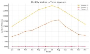 The line graph illustrates the number of visitors to three different museums over a twelve-month period.
