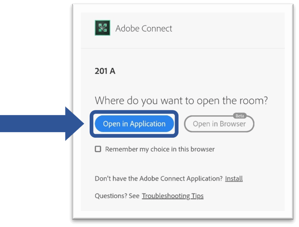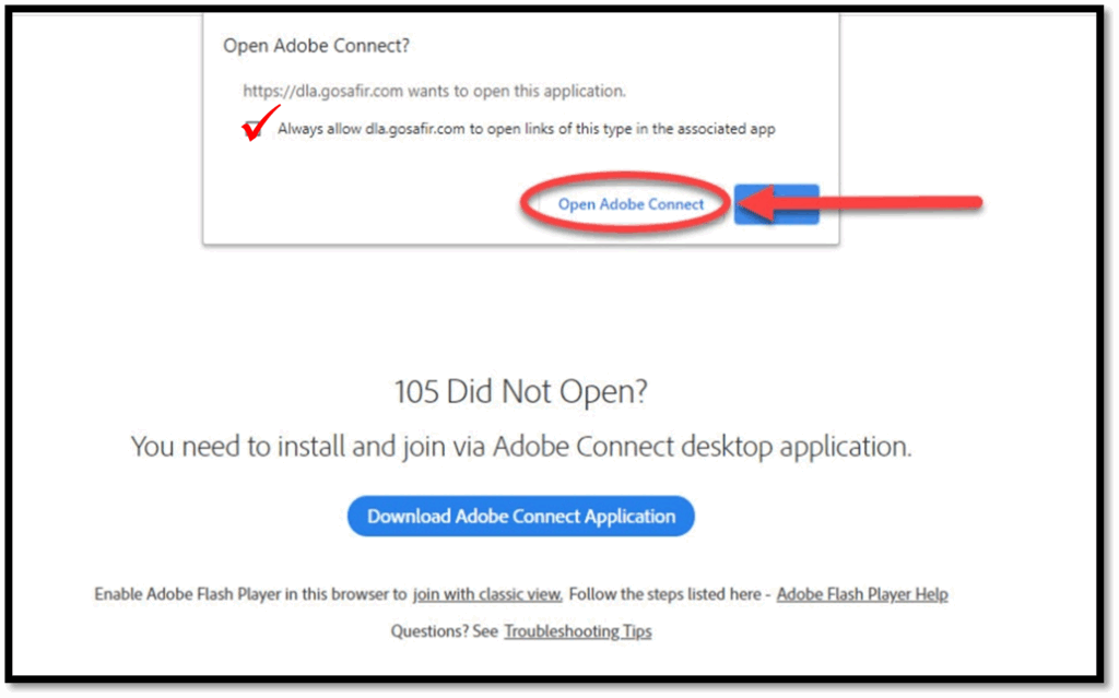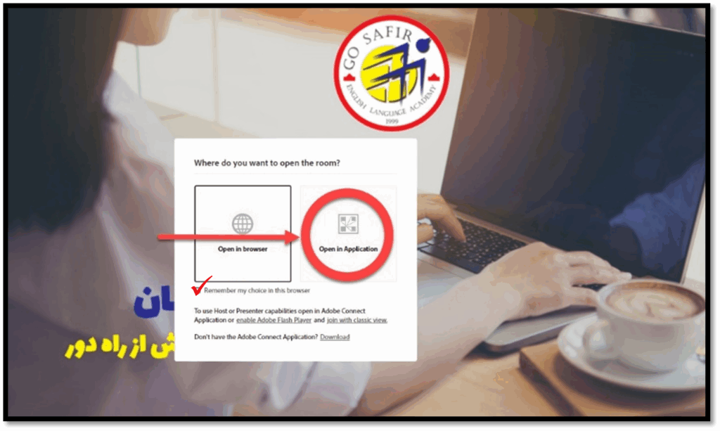 مربع ابتدایی را فعال نموده (تیک قرمز) و با کلیک کردن روی Open Adobe Connect وارد کلاس شوید.