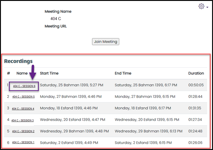 نحوه مشاهده جلسات آنلاین ضبط شده: مشاهده جلسات آنلاین ضبط شده فقط از طریق لپتاپ یا کامپیوتر امکان پذیر است. برای این کار روی “ورود به جلسه آنلاین و مشاهده جلسات ضبط شده” کلیک کنید. در قسمت پایین صفحه لیست جلسات ضبط شده قابل مشاهده است(کادر قرمز). روی نام جلسه کلیک کنید(به رنگ بنفش). مانند عکسهای بالا Open in Application را انتخاب کرده و وارد جلسه شوید.
